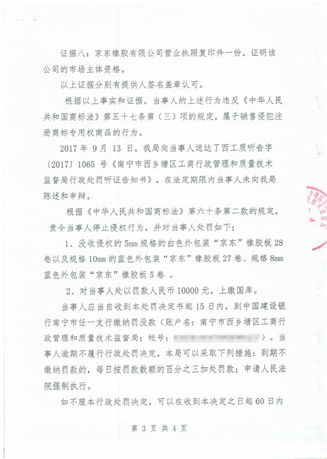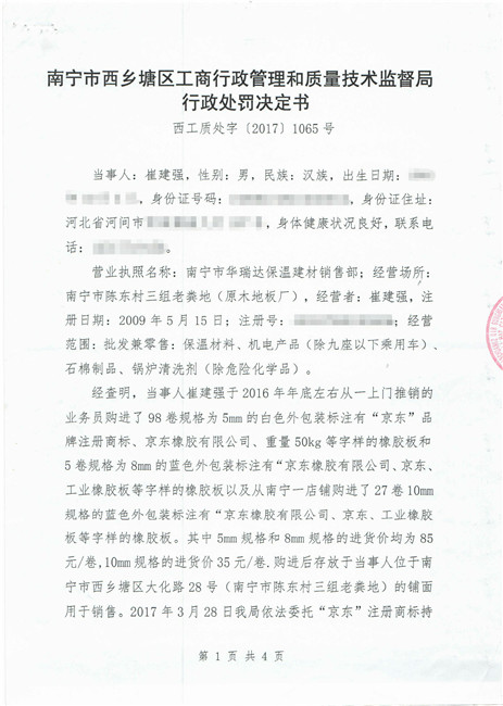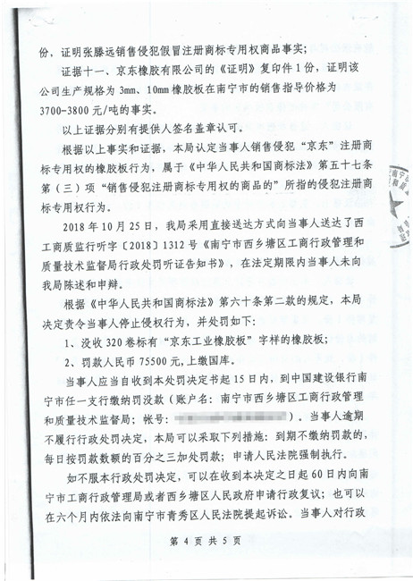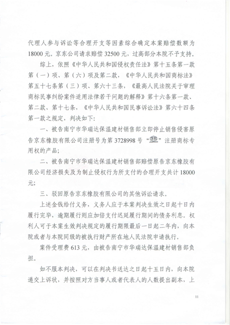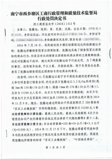 截止到2018年11月份,廣西南寧西鄉(xiāng)塘區(qū)工商行政管理和質(zhì)量技術(shù)監(jiān)督局對假冒我公司商標(biāo)侵權(quán)行為進(jìn)行行政處罰:崔建強(qiáng)[西工質(zhì)處字(2017)1065號] 10000元;張騰遠(yuǎn)[西工商質(zhì)監(jiān)處字(2018)1312號] 75500元。全部上繳國庫。并對這兩起案件我公司也進(jìn)行了司法賠償判決。
